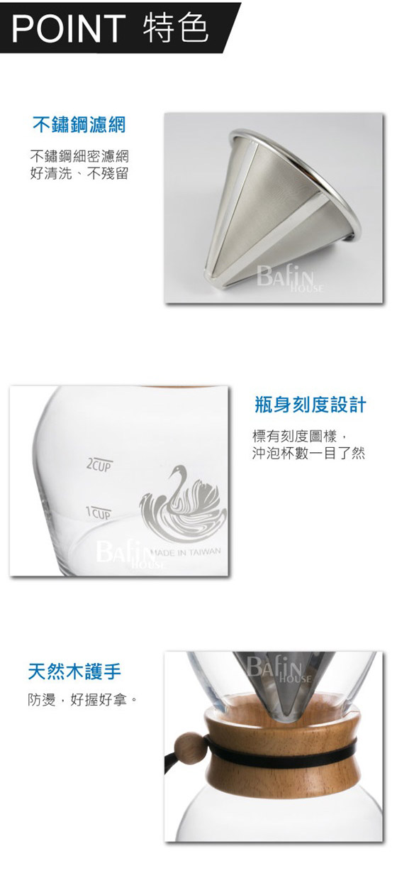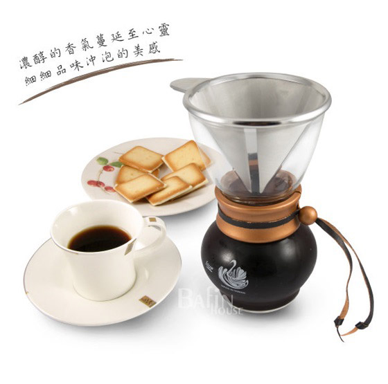 沖泡壺採錐形濾網設計,讓咖啡粉充分浸泡,完美釋放香氣與甘醇