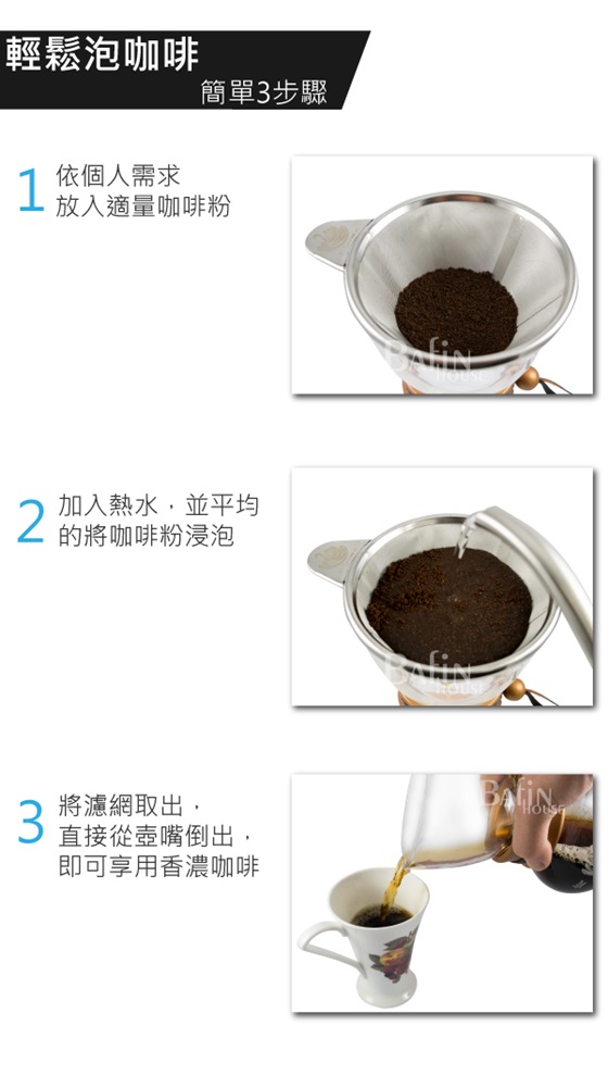 濾網選用304不鏽鋼濾網,免用濾紙,方便環保且清洗方便
