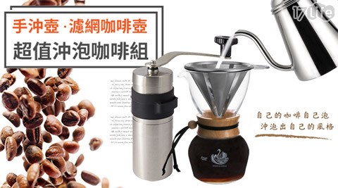 只要880元起(含運)即可享有【NO.1 達人咖啡】原價最高2,550元濾網玻璃沖泡壺+【Welead 】職人手沖壺+【Welead】不鏽鋼陶瓷芯磨豆機(隨身型)超殺特惠組:(A)濾網玻璃沖泡壺(2人份)1組/(B)濾網玻璃沖泡壺2人份+【Welead】職人手沖壺1組/(C)濾網玻璃沖泡壺2人份+【Welead】職人手沖壺+【Welead】不鏽鋼陶瓷芯磨豆機(隨身型)1組。